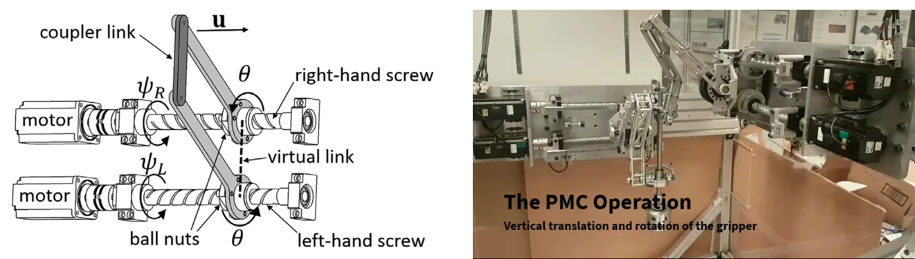Packaging and assembly operations are calling for ever faster means of delivering low-cost, high-quality products, which has motivated the development of fast pick-and-place robots. The tasks at hand usually comprise motions involving the subgroup of Schoenflies displacements. This is characterized by three translations and one rotation about an axis of fixed orientation. The main challenge these systems pose to their designers is the 180-deg turn of their moving platform. Commercial robots of this kind are supplied with ingenious mechanisms to produce this rotation, but the mechanism adds a substantial complexity to the overall system. As an alternative, a family of simple, isostatic architectures was proposed recently by researchers. These architectures include two limbs, each carrying a cylindrical shoulder, which is actuated by, and ending up by screw nuts coupled to each forearm by means of a universal joint. A vertical rod carries two screws of distinct pitches in series, the gripper at the lower end, playing the role of the moving platform of parallel robots. The rod is displaced with four degrees of freedom in a similar fashion to the long peppermill seen in Italian restaurants, with the two screw nuts playing the role of the waiter‘s hands. Moreover, each shoulder is driven by one collar that undergoes cylindrical motion (rotation about an axis and translation along a direction parallel to the axis), the challenge here being the design of the drive that can provide the 2-DOF of a cylindrical motion. Such a mechanism, dubbed the C-drive and developed at McGill University, is actuated by two identical motors that are fixed to the base, and carries a closed kinematic chain that was synthesized by means of an application of the theory of displacement subgroups, which is currently developed at McGill University, with one C-drive per arm. The operation principles of the robot and its main components are highlighted in this presentation.