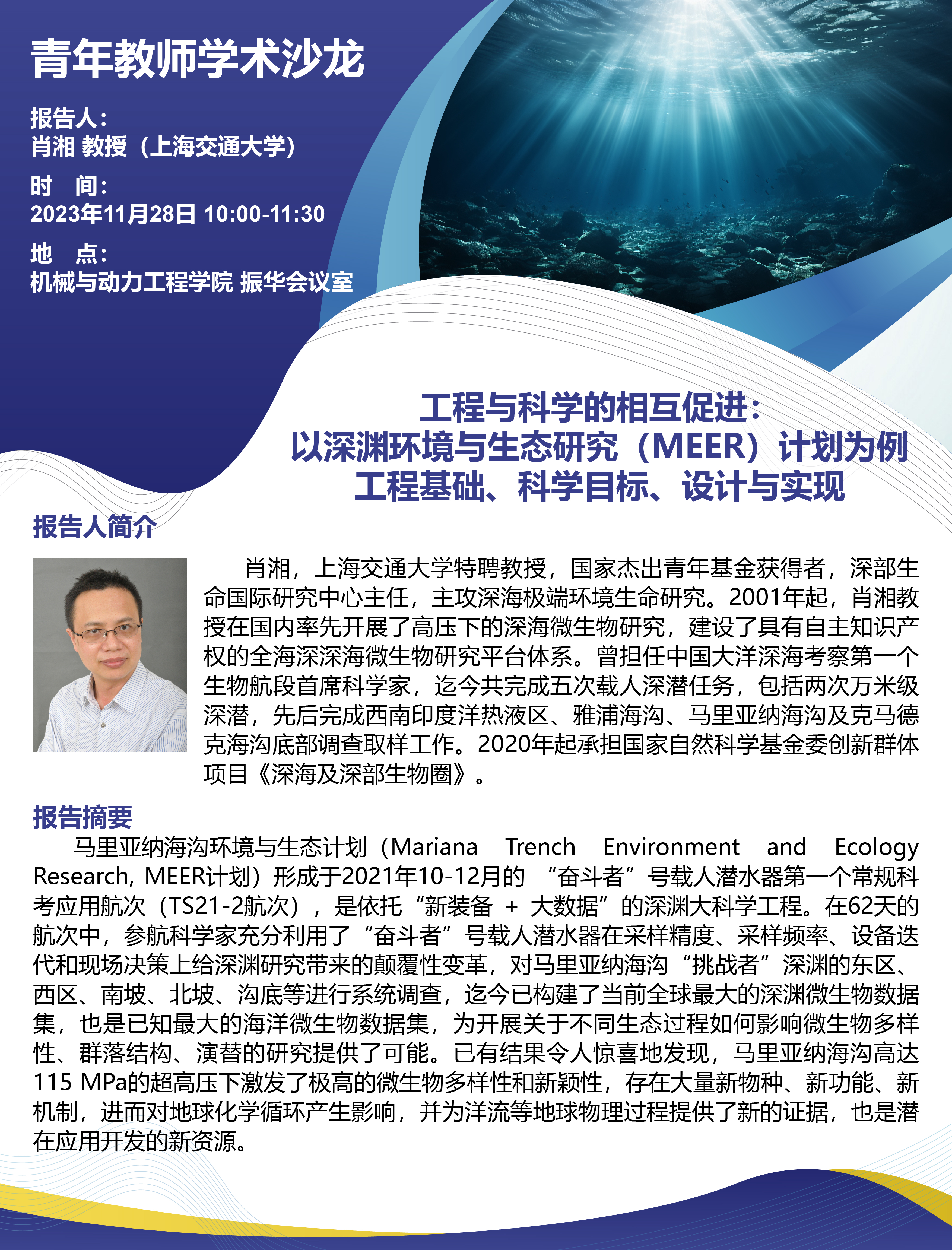 肖湘,上海交通大学特聘教授,国家杰出青年基金获得者,深部生命国际研究中心主任,主攻深海极端环境生命研究。2001年起,肖湘教授在国内率先开展了高压下的深海微生物研究,建设了具有自主知识产权的全海深深海微生物研究平台体系。曾担任中国大洋深海考察第一个生物航段首席科学家,迄今共完成五次载人深潜任务,包括两次万米级深潜,先后完成西南印度洋热液区、雅浦海沟、马里亚纳海沟及克马德克海沟底部调查取样工作。2020年起承担国家自然科学基金委创新群体项目《深海及深部生物圈》。