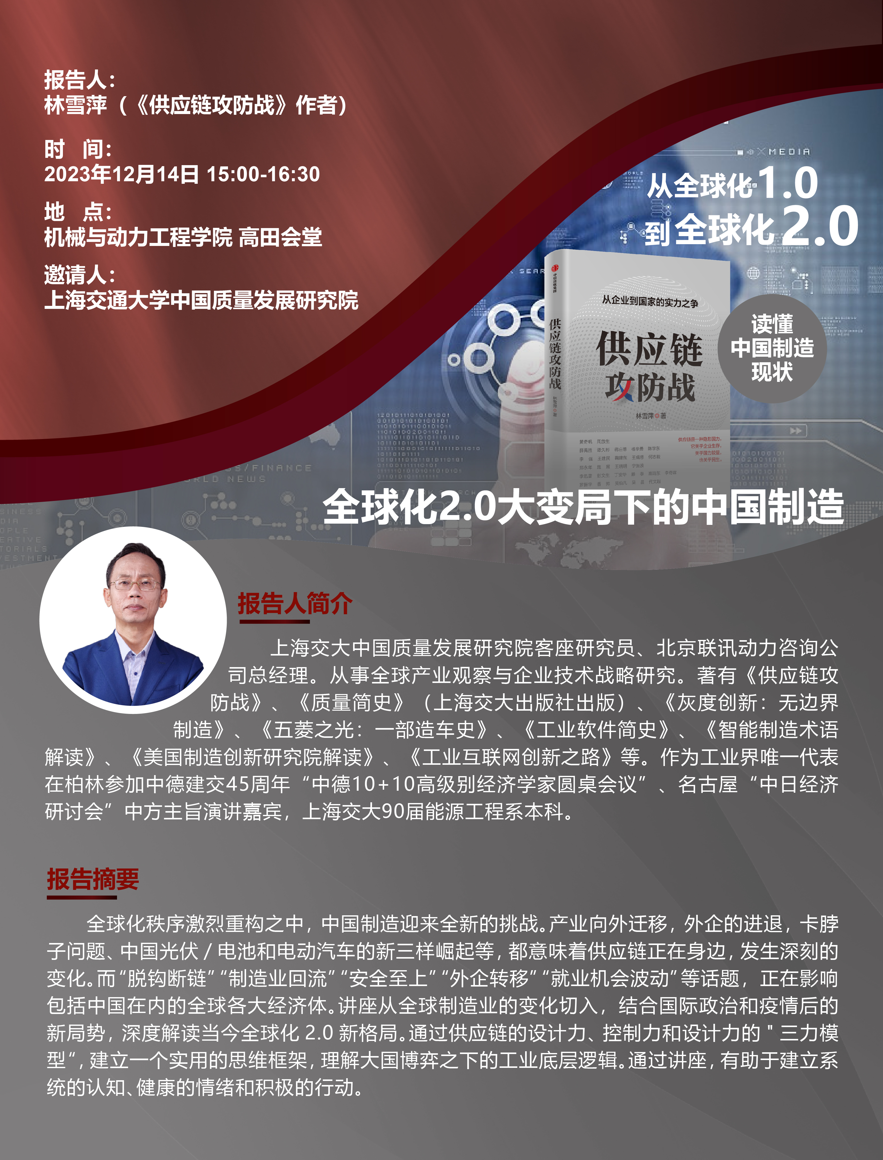 全球化秩序激烈重构之中,中国制造迎来全新的挑战。产业向外迁移,外企的进退,卡脖子问题、中国光伏/电池和电动汽车的新三样崛起等,都意味着供应链正在身边,发生深刻的变化。而“脱钩断链”“制造业回流”“安全至上”“外企转移”“就业机会波动”等话题,正在影响包括中国在内的全球各大经济体。讲座从全球制造业的变化切入,结合国际政治和疫情后的新局势,深度解读当今全球化2.0新格局。通过供应链的设计力、控制力和设计力的"三力模型“,建立一个实用的思维框架,理解大国博弈之下的工业底层逻辑。通过讲座,有助于建立系统的认知、健康的情绪和积极的行动。