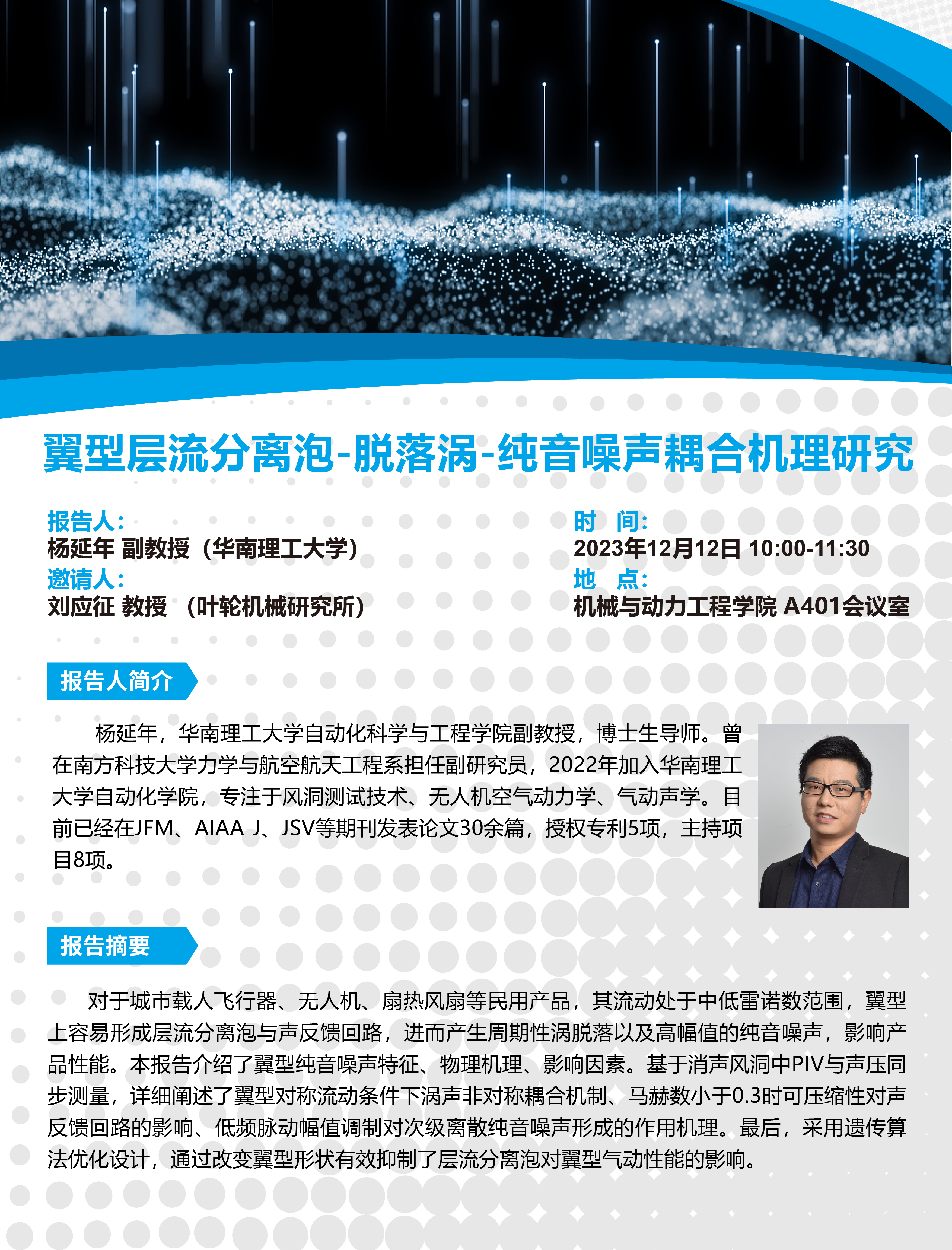 在中低雷诺数小攻角范围,翼型上易形成层流分离泡,进而产生声反馈回路以及高幅值的纯音噪声。基于消声风洞中PIV与远场声压同步测量,本报告介绍了对称流动条件下涡声非对称耦合机制、马赫数小于0.3时可压缩性对声反馈回路的影响、幅值调制在次级离散纯音噪声中的作用机理,最后通过外形优化抑制了分离泡对气动性能的影响。