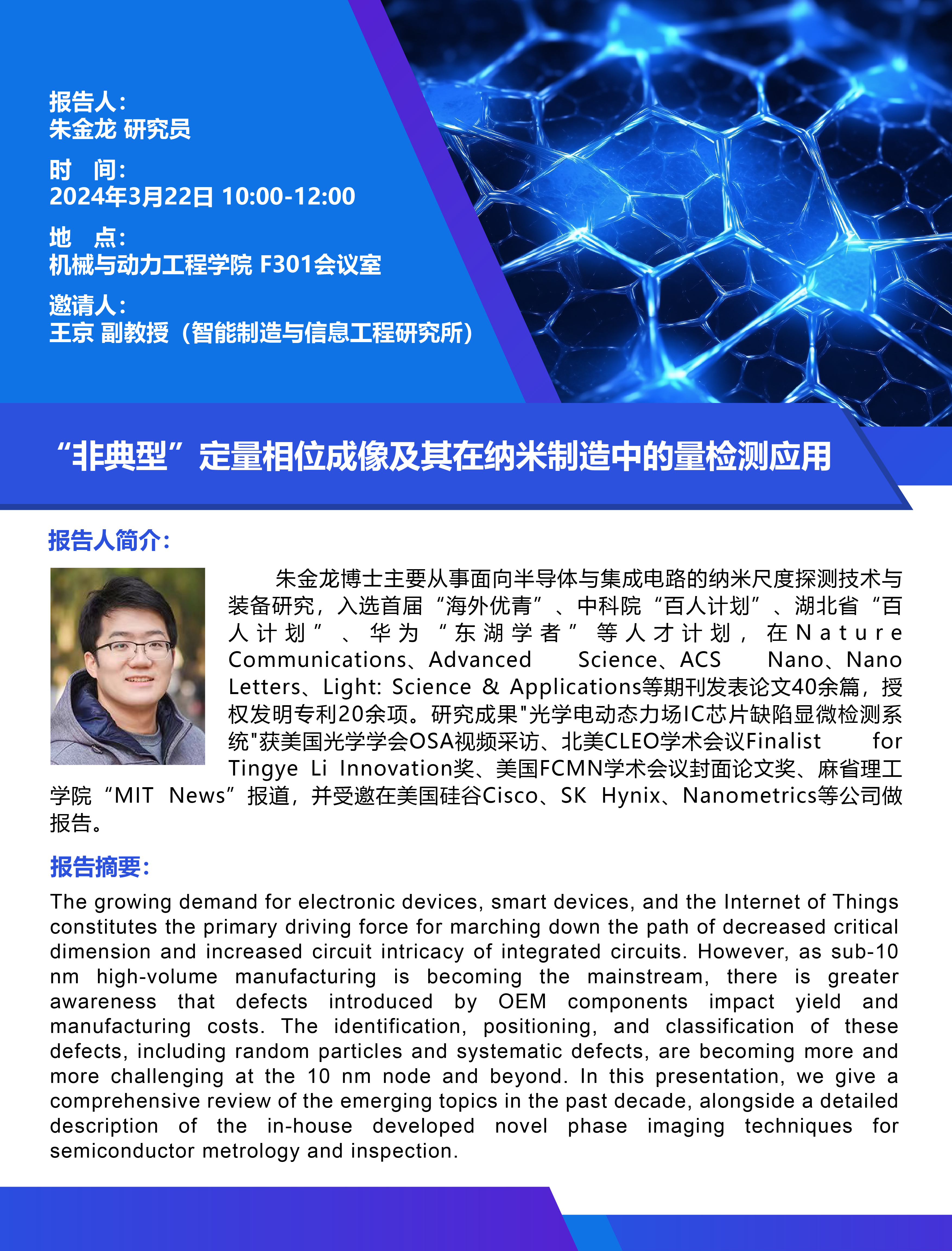 邀请人:王京 副教授(智能制造与信息工程研究所)