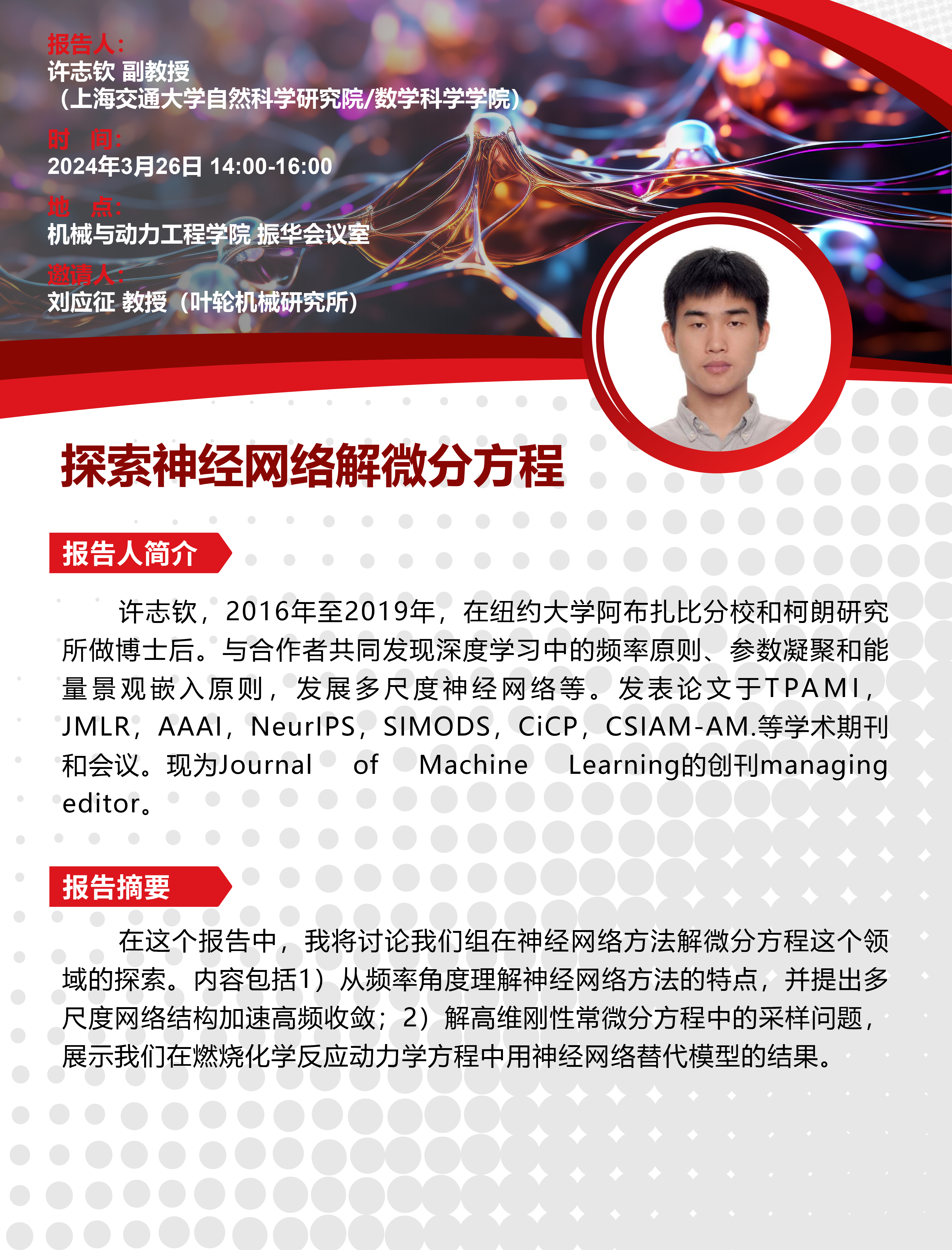 在这个报告中,我将讨论我们组在神经网络方法解微分方程这个领域的探索。内容包括1)从频率角度理解神经网络方法的特点,并提出多尺度网络结构加速高频收敛;2)解高维刚性常微分方程中的采样问题,展示我们在燃烧化学反应动力学方程中用神经网络替代模型的结果。