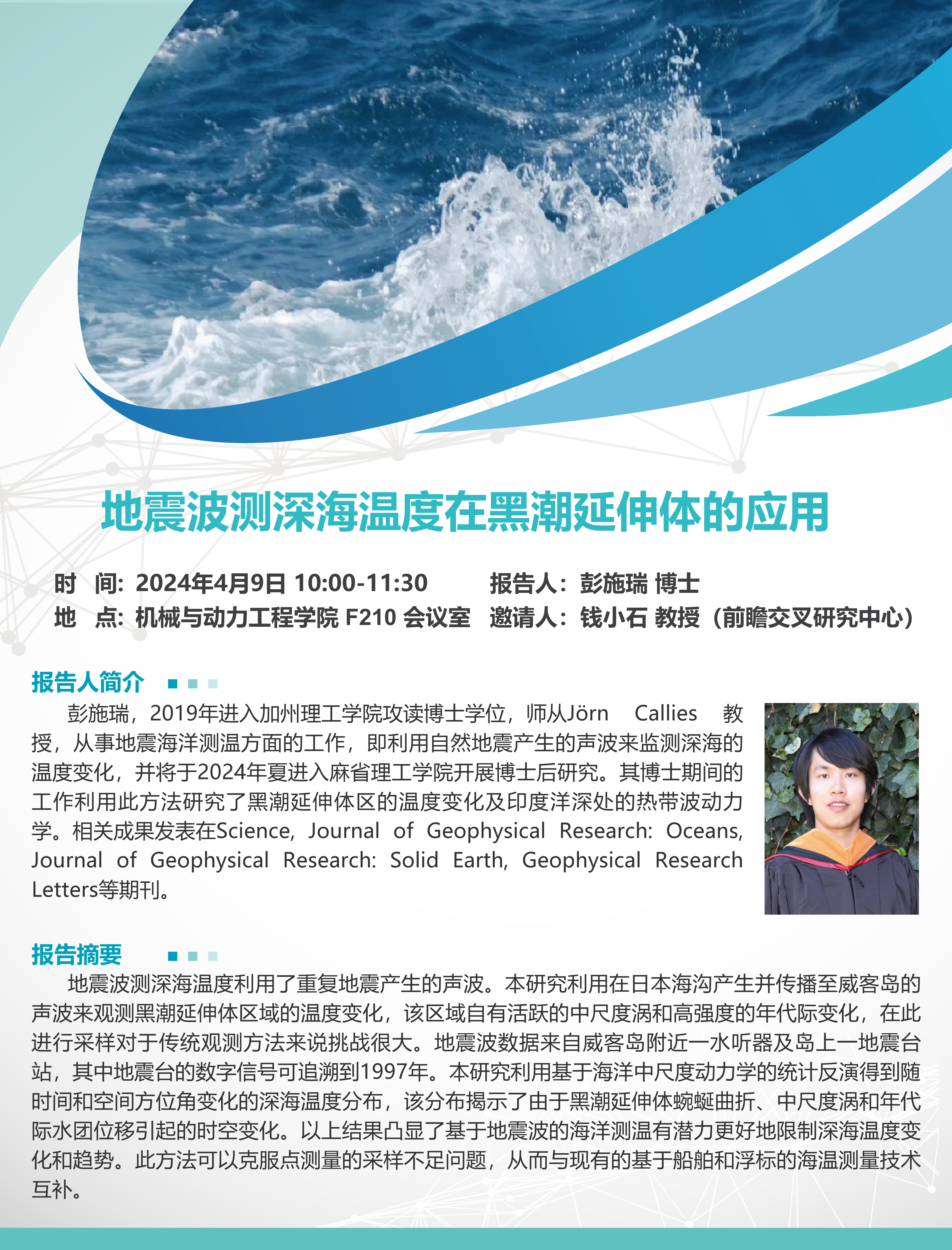 彭施瑞,2019年进入加州理工学院攻读博士学位,师从Jörn Callies 教授,从事地震海洋测温方面的工作,即利用自然地震产生的声波来监测深海的温度变化,并将于2024年夏进入麻省理工学院开展博士后研究。其博士期间的工作利用此方法研究了黑潮延伸体区的温度变化及印度洋深处的热带波动力学。相关成果发表在Science, Journal of Geophysical Research: Oceans, Journal of Geophysical Research: Solid Earth, Geophysical Research Letters等期刊。