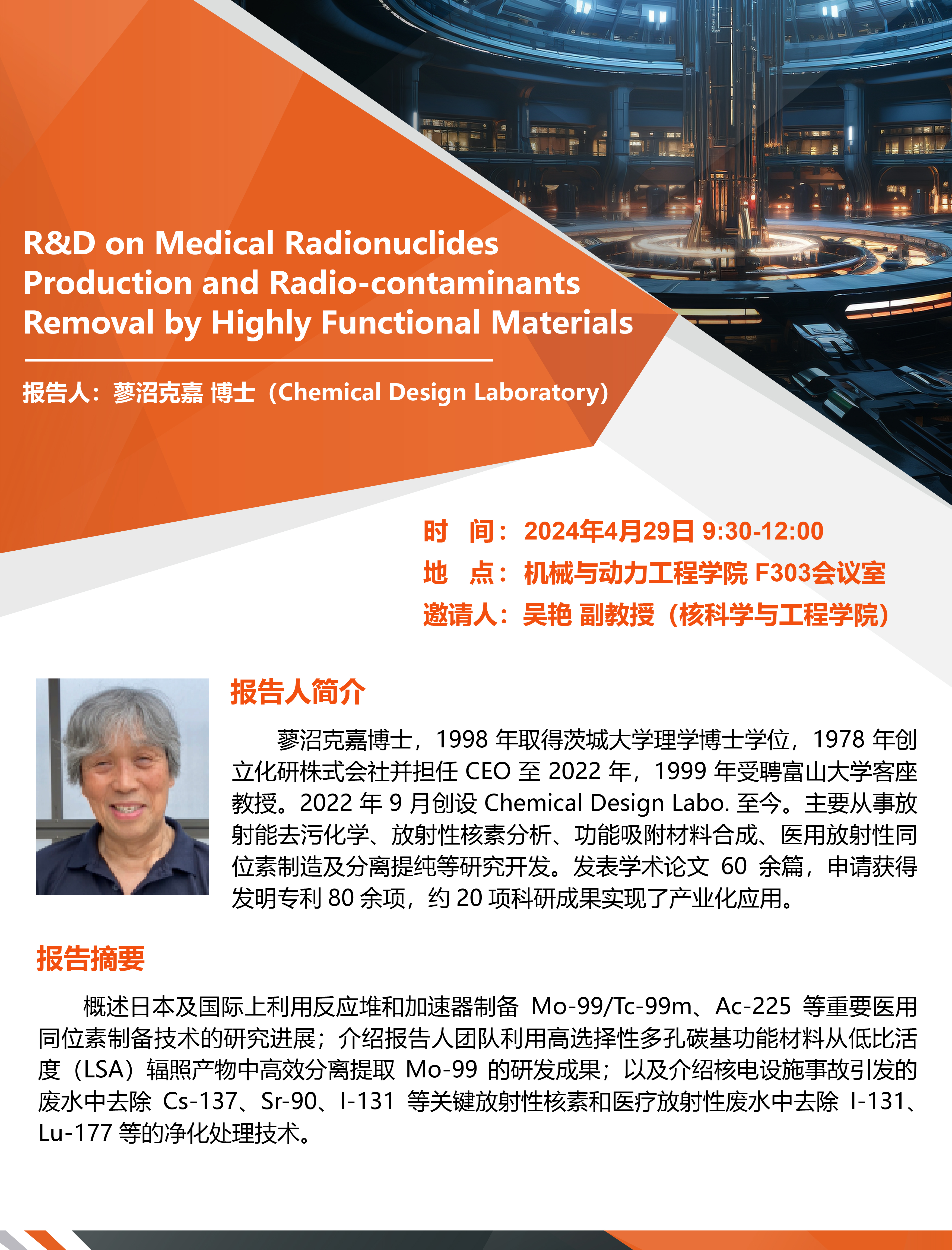 概述日本及国际上利用反应堆和加速器制备Mo-99/Tc-99m、Ac-225等重要医用同位素制备技术的研究进展;介绍报告人团队利用高选择性多孔碳基功能材料从低比活度(LSA)辐照产物中高效分离提取Mo-99的研发成果;以及介绍核电设施事故引发的废水中去除Cs-137、Sr-90、I-131等关键放射性核素和医疗放射性废水中去除I-131、Lu-177等的净化处理技术。