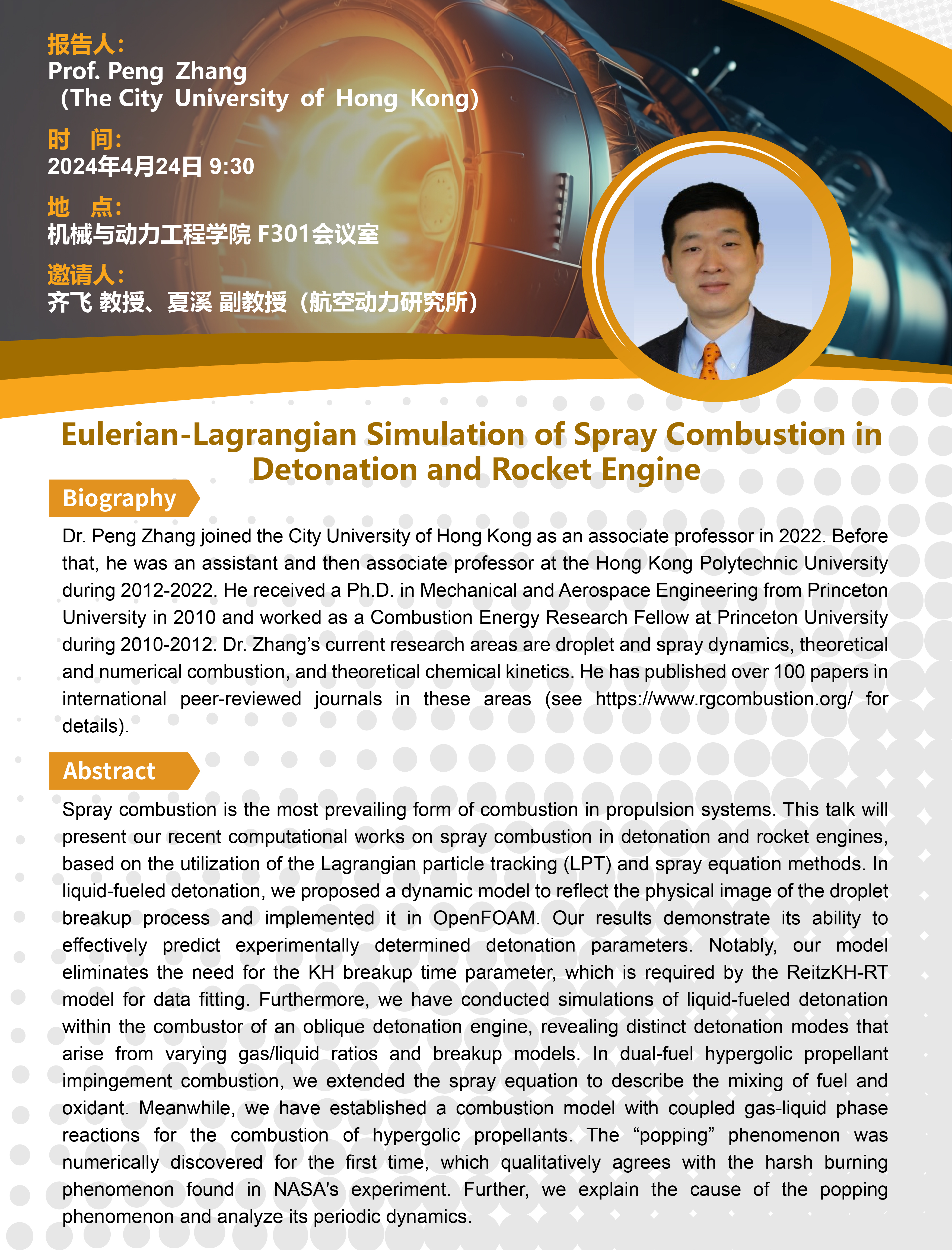 Dr. Peng Zhang joined the City University of Hong Kong as an associate professor in 2022. Before that, he was an assistant and then associate professor at the Hong Kong Polytechnic University during 2012-2022. He received a Ph.D. in Mechanical and Aerospace Engineering from Princeton University in 2010 and worked as a Combustion Energy Research Fellow at Princeton University during 2010-2012. Dr. Zhang’s current research areas are droplet and spray dynamics, theoretical and numerical combustion, and theoretical chemical kinetics. He has published over 100 papers in international peer-reviewed journals in these areas (see https://www.rgcombustion.org/ for details).