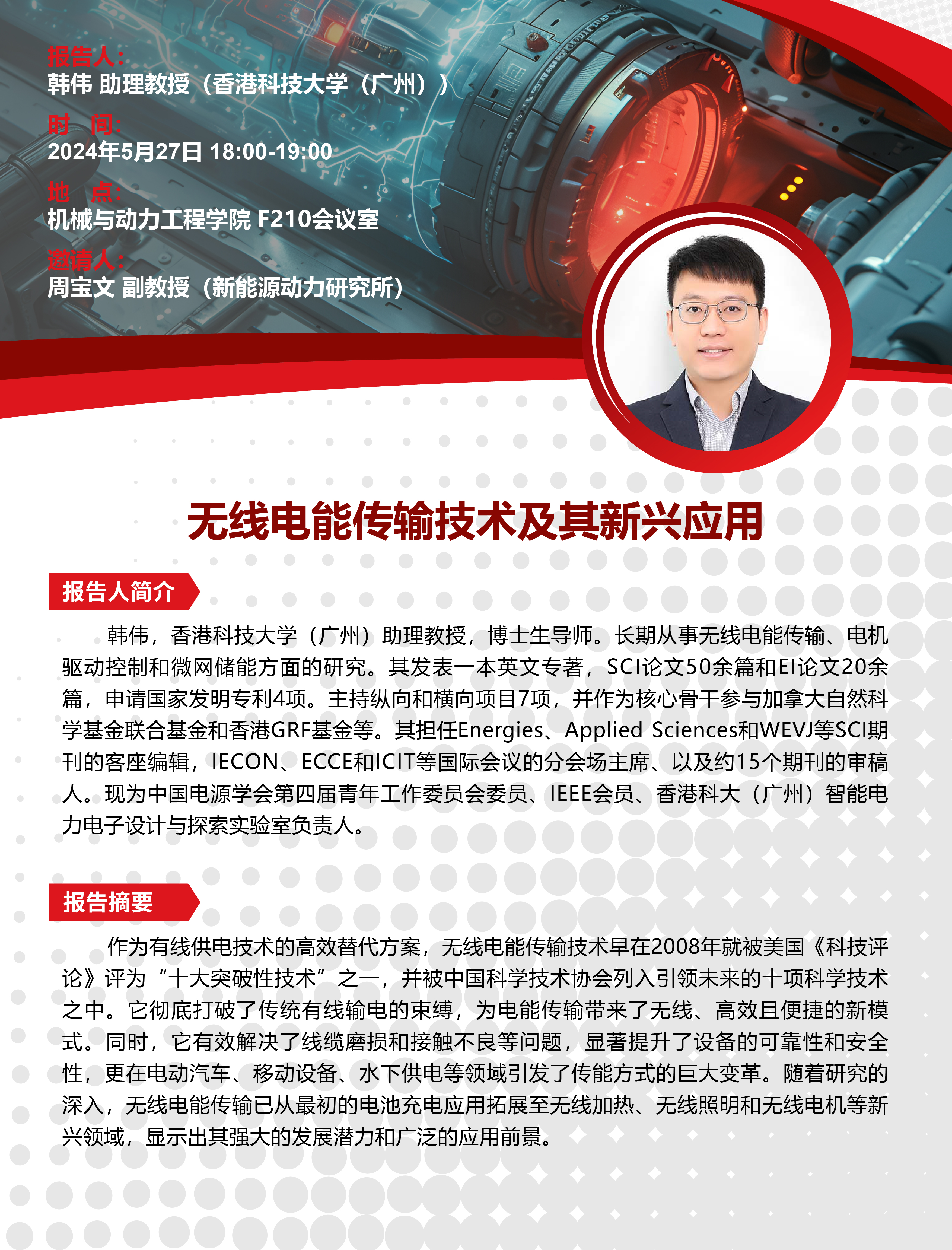 韩伟,香港科技大学(广州)助理教授,博士生导师。长期从事无线电能传输、电机驱动控制和微网储能方面的研究。其发表一本英文专著,SCI论文50余篇和EI论文20余篇,申请国家发明专利4项。主持纵向和横向项目7项,并作为核心骨干参与加拿大自然科学基金联合基金和香港GRF基金等。其担任Energies、Applied Sciences和WEVJ等SCI期刊的客座编辑,IECON、ECCE和ICIT等国际会议的分会场主席、以及约15个期刊的审稿人。现为中国电源学会第四届青年工作委员会委员、IEEE会员、香港科大(广州)智能电力电子设计与探索实验室负责人。