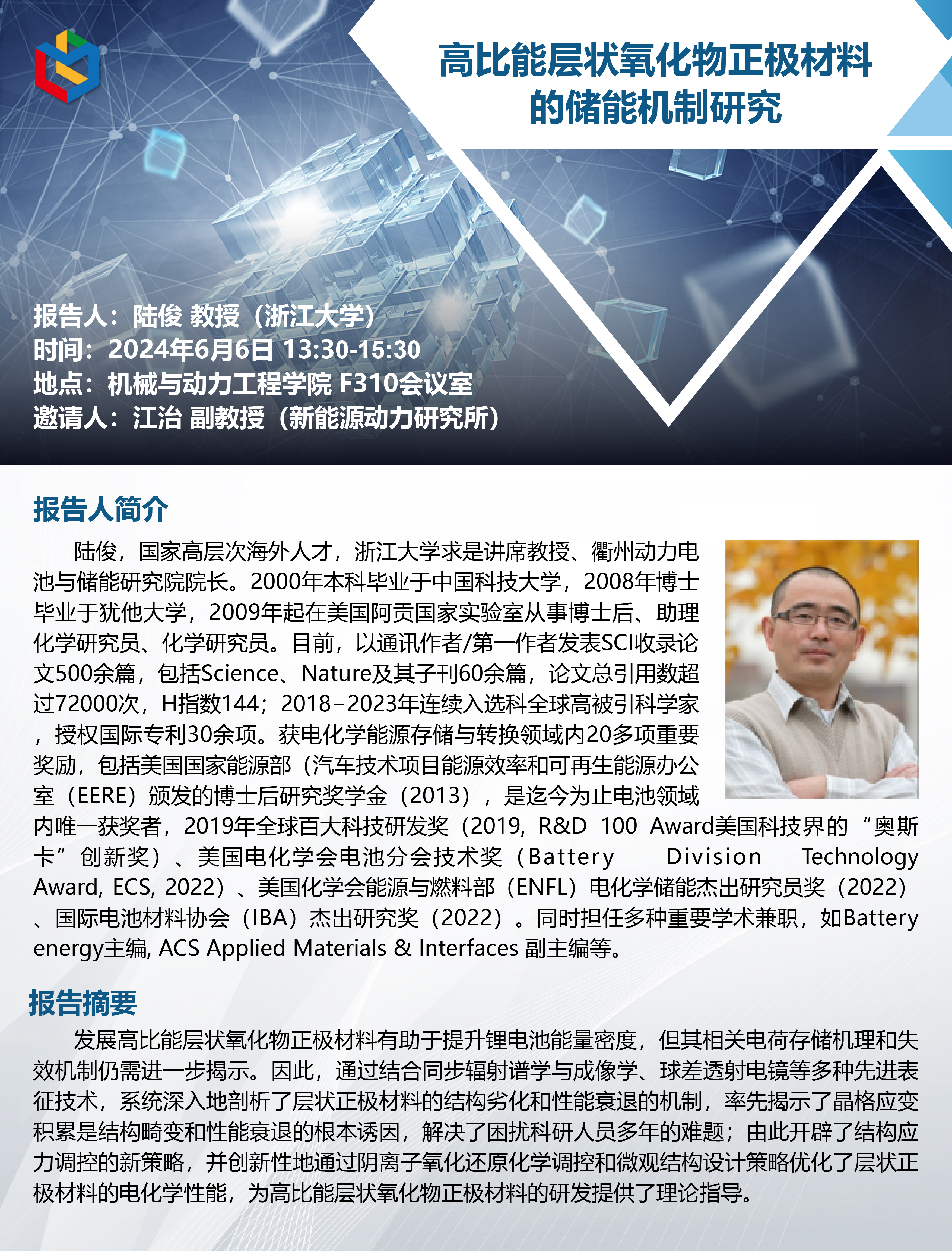 陆俊,国家高层次海外人才,浙江大学求是讲席教授、衢州动力电池与储能研究院院长。2000年本科毕业于中国科技大学,2008年博士毕业于犹他大学,2009年起在美国阿贡国家实验室从事博士后、助理化学研究员、化学研究员。目前,以通讯作者/第一作者发表SCI收录论文500余篇,包括Science、Nature及其子刊60余篇,论文总引用数超过72000次,H指数144;2018−2023年连续入选科全球高被引科学家,授权国际专利30余项。获电化学能源存储与转换领域内20多项重要奖励,包括美国国家能源部(汽车技术项目能源效率和可再生能源办公室(EERE)颁发的博士后研究奖学金(2013),是迄今为止电池领域内唯一获奖者,2019年全球百大科技研发奖(2019, R&D 100 Award美国科技界的“奥斯卡”创新奖)、美国电化学会电池分会技术奖(Battery Division Technology Award, ECS, 2022)、美国化学会能源与燃料部(ENFL)电化学储能杰出研究员奖(2022)、国际电池材料协会(IBA)杰出研究奖(2022)。同时担任多种重要学术兼职,如Battery energy主编, ACS Applied Materials & Interfaces 副主编等。