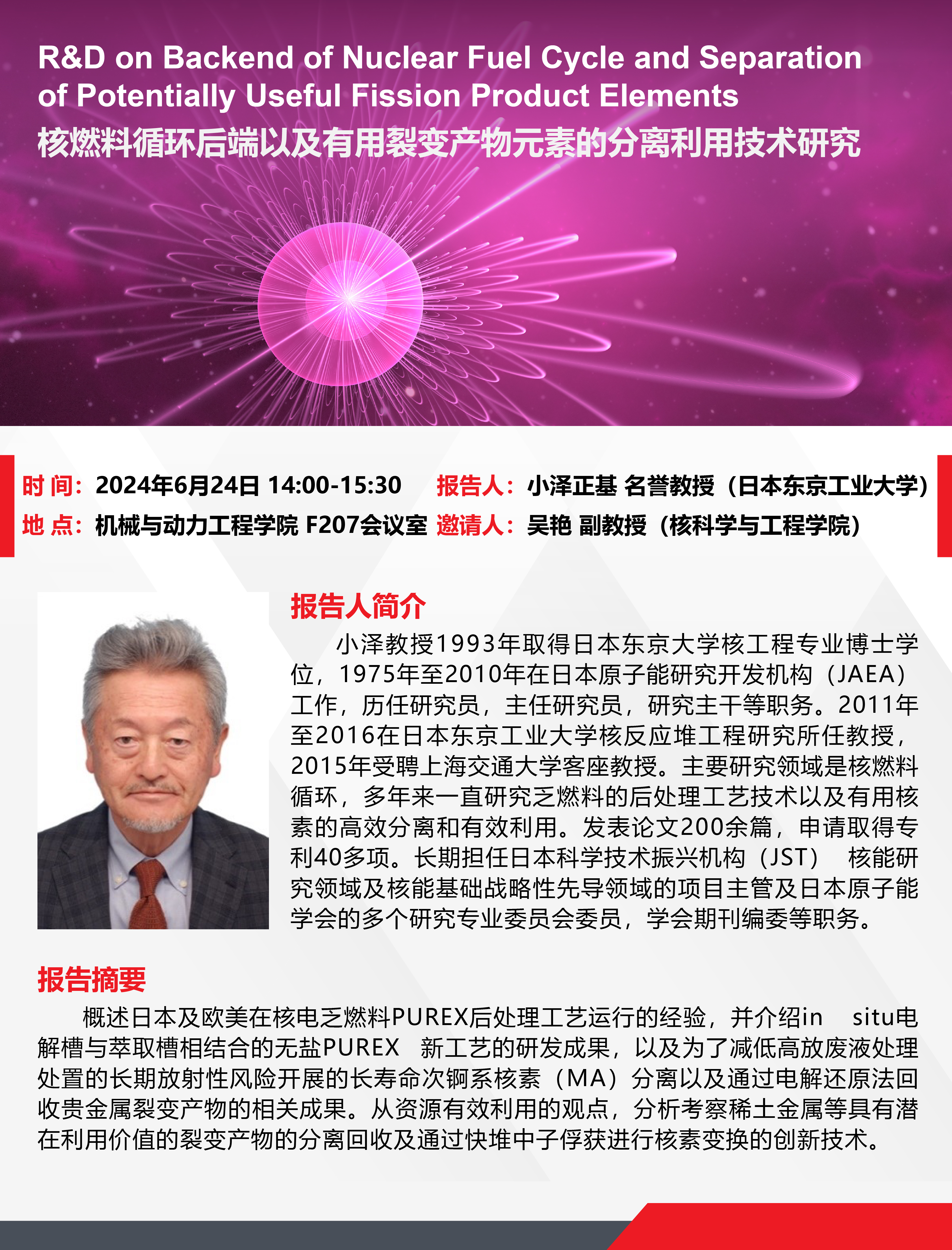 小泽教授1993年取得日本东京大学核工程专业博士学位,1975年至2010年在日本原子能研究开发机构(JAEA)工作,历任研究员,主任研究员,研究主干等职务。2011年至2016在日本东京工业大学核反应堆工程研究所任教授,2015年受聘上海交通大学客座教授。主要研究领域是核燃料循环,多年来一直研究乏燃料的后处理工艺技术以及有用核素的高效分离和有效利用。发表论文200余篇,申请取得专利40多项。长期担任日本科学技术振兴机构(JST) 核能研究领域及核能基础战略性先导领域的项目主管及日本原子能学会的多个研究专业委员会委员,学会期刊编委等职务。