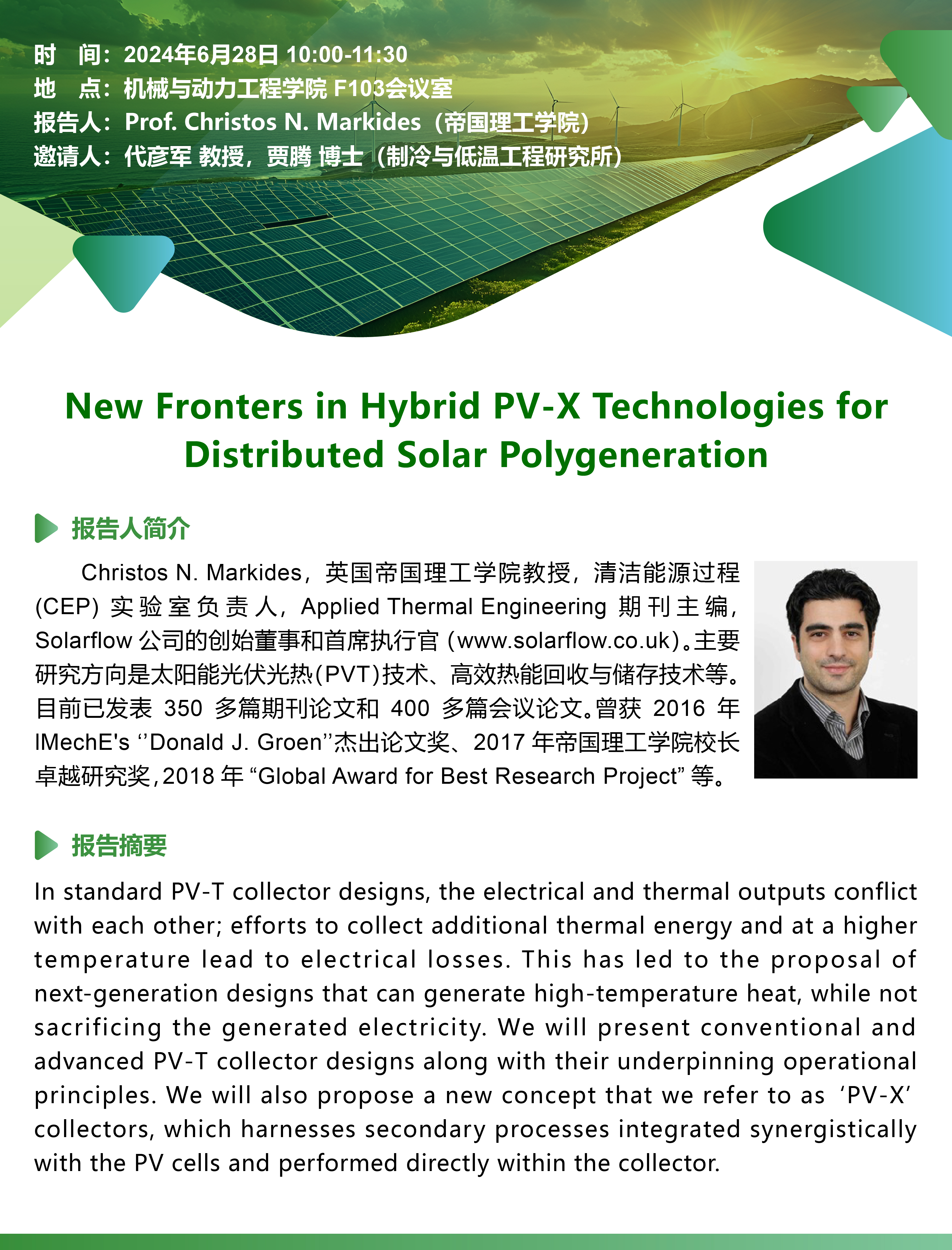 题目:New Fronters in Hybrid PV-X Technologies for Distributed Solar Polygeneration