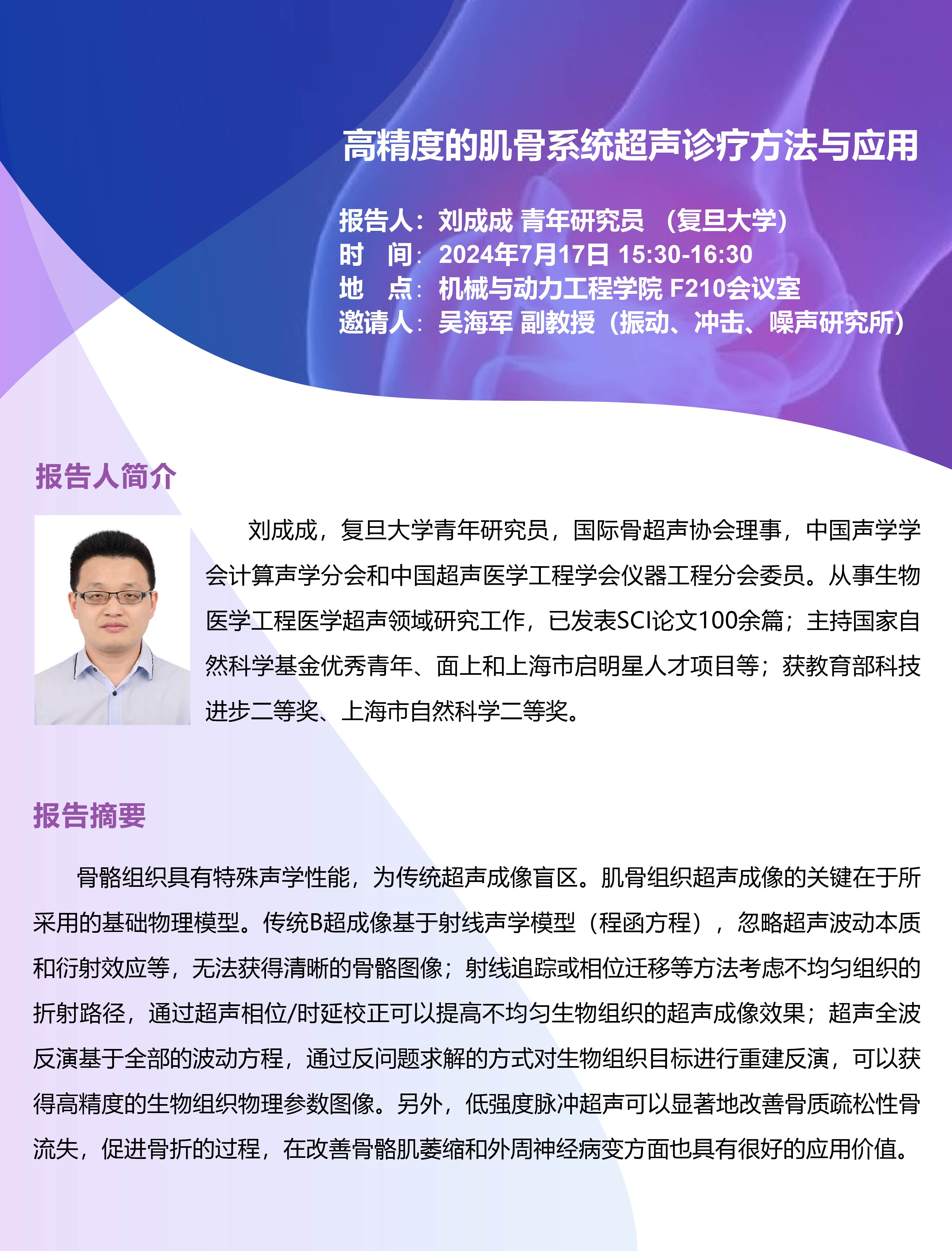 刘成成,复旦大学青年研究员,国际骨超声协会理事,中国声学学会计算声学分会和中国超声医学工程学会仪器工程分会委员。从事生物医学工程医学超声领域研究工作,已发表SCI论文100余篇;主持国家自然科学基金优秀青年、面上和上海市启明星人才项目等;获教育部科技进步二等奖、上海市自然科学二等奖。