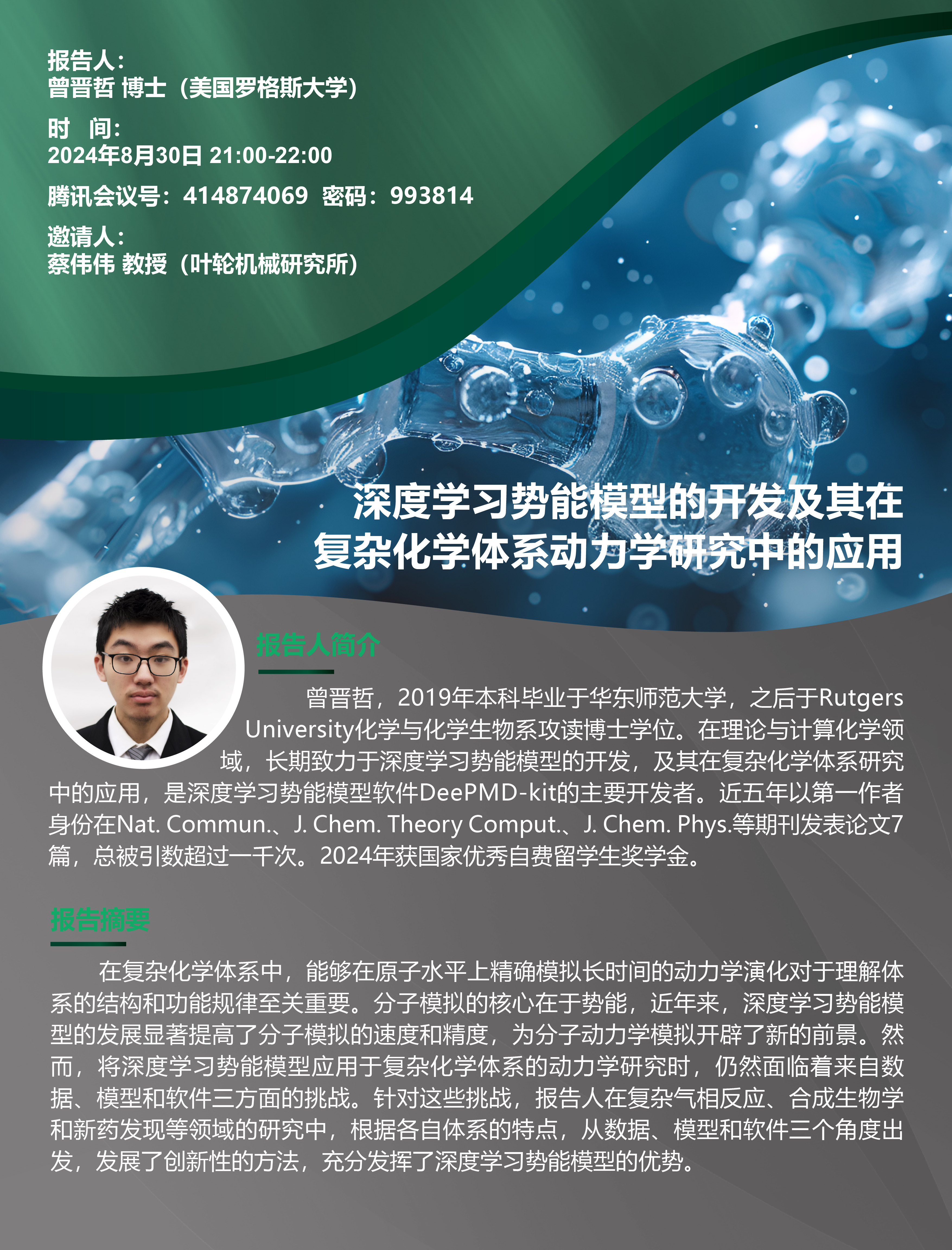 题目:深度学习势能模型的开发及其在复杂化学体系动力学研究中的应用