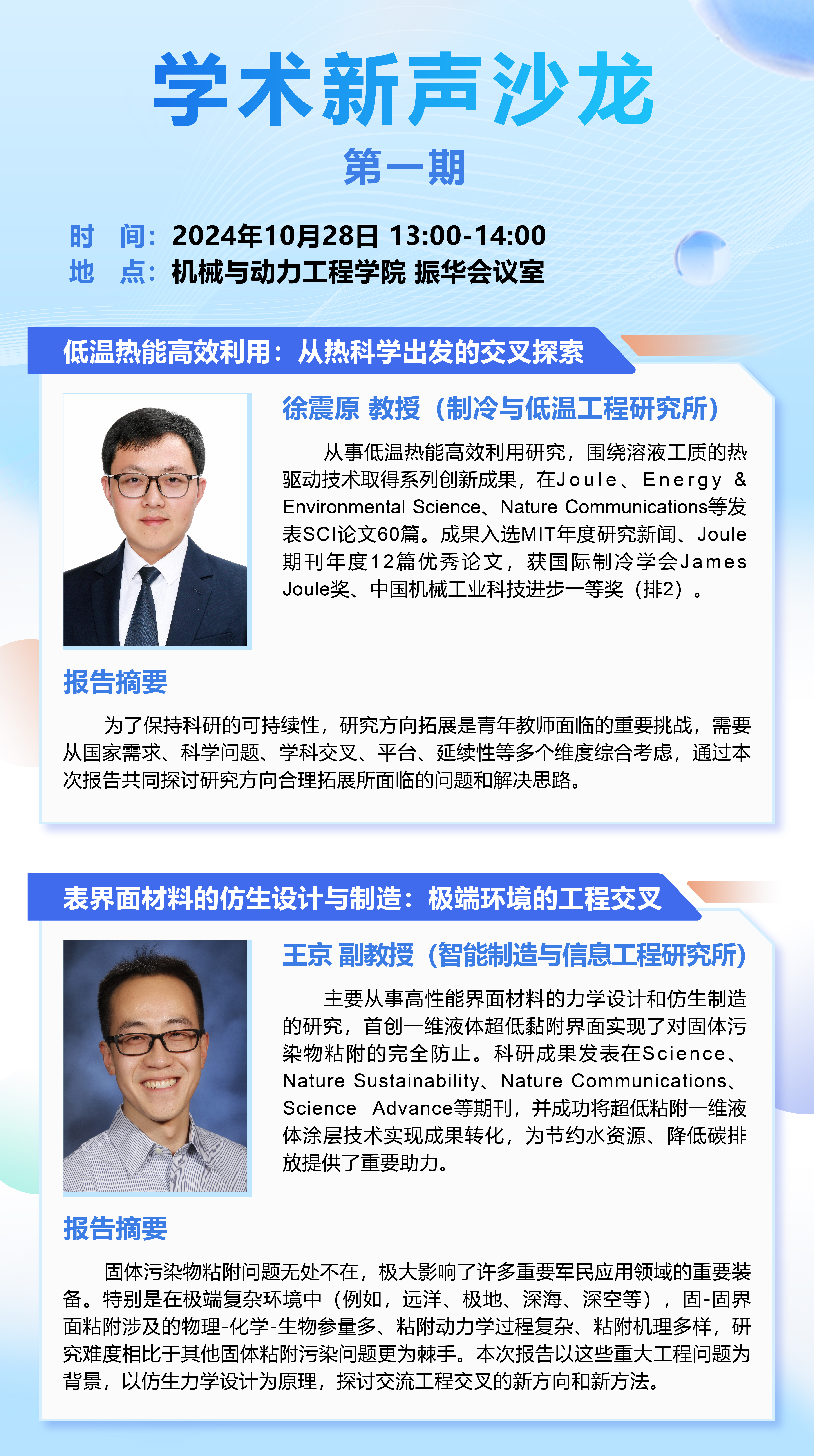 题目:低温热能高效利用:从热科学出发的交叉探索/表界面材料的仿生设计与制造:极端环境的工程交叉