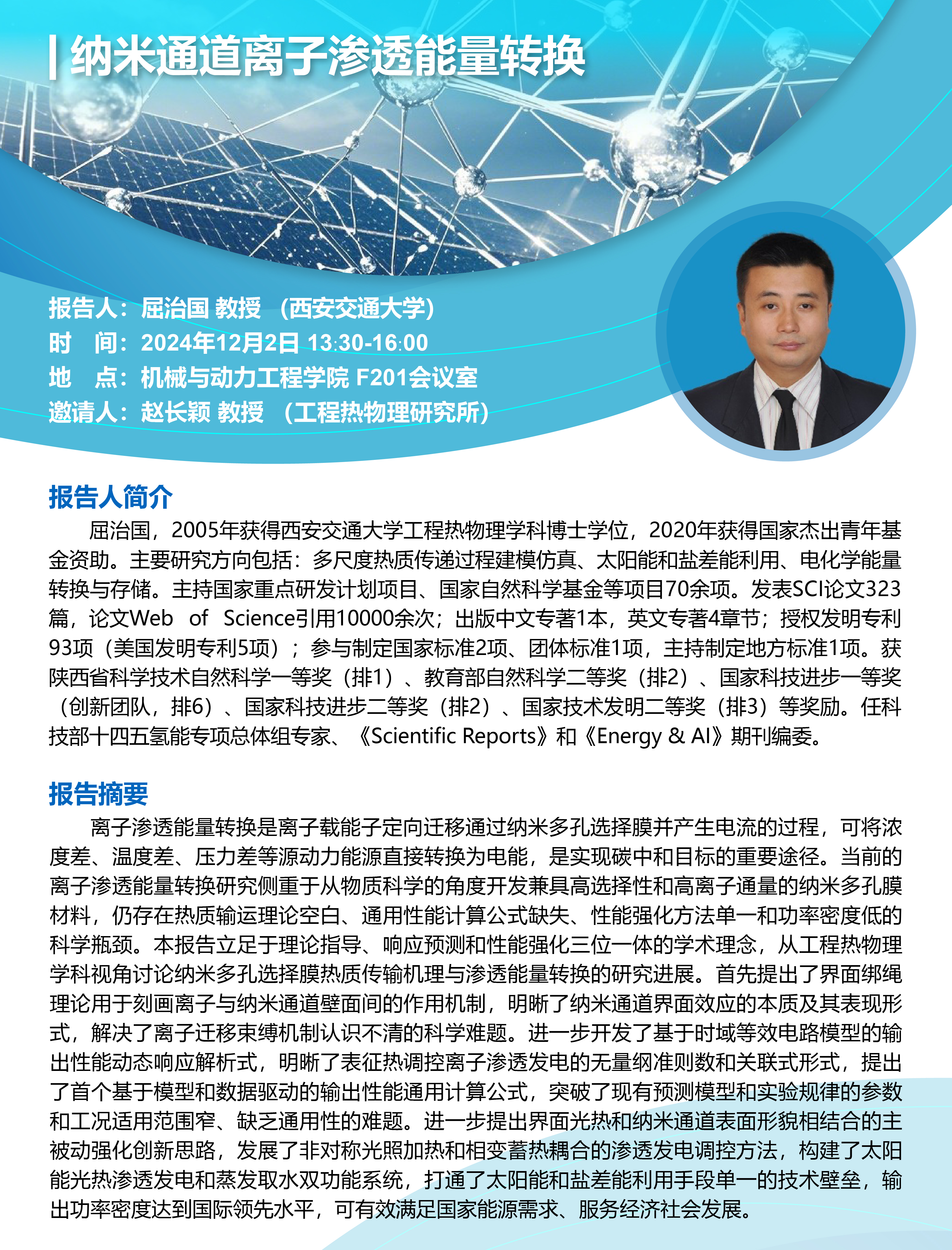 离子渗透能量转换是离子载能子定向迁移通过纳米多孔选择膜并产生电流的过程,可将浓度差、温度差、压力差等源动力能源直接转换为电能,是实现碳中和目标的重要途径。当前的离子渗透能量转换研究侧重于从物质科学的角度开发兼具高选择性和高离子通量的纳米多孔膜材料,仍存在热质输运理论空白、通用性能计算公式缺失、性能强化方法单一和功率密度低的科学瓶颈。本报告立足于理论指导、响应预测和性能强化三位一体的学术理念,从工程热物理学科视角讨论纳米多孔选择膜热质传输机理与渗透能量转换的研究进展。首先提出了界面绑绳理论用于刻画离子与纳米通道壁面间的作用机制,明晰了纳米通道界面效应的本质及其表现形式,解决了离子迁移束缚机制认识不清的科学难题。进一步开发了基于时域等效电路模型的输出性能动态响应解析式,明晰了表征热调控离子渗透发电的无量纲准则数和关联式形式,提出了首个基于模型和数据驱动的输出性能通用计算公式,突破了现有预测模型和实验规律的参数和工况适用范围窄、缺乏通用性的难题。进一步提出界面光热和纳米通道表面形貌相结合的主被动强化创新思路,发展了非对称光照加热和相变蓄热耦合的渗透发电调控方法,构建了太阳能光热渗透发电和蒸发取水双功能系统,打通了太阳能和盐差能利用手段单一的技术壁垒,输出功率密度达到国际领先水平,可有效满足国家能源需求、服务经济社会发展。