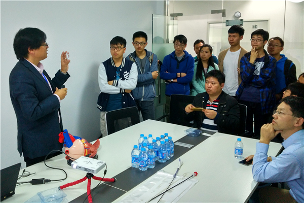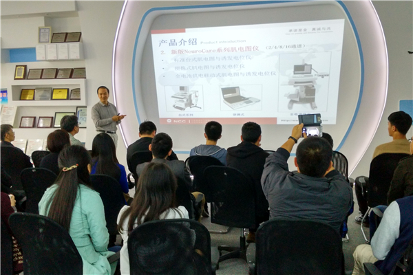 诺诚医疗的总工程师张群峰为大家详细讲解了诺诚各类产品的研发现状。公司根植于电生理与康复领域,主要业务集中于电生理诊断、神经康复、功能监护、家庭诊疗四大方向。大家在提问交流过程中,了解到许多神经康复领域的新知识。张群峰带领师生来到了诺诚的展览厅,展厅内陈列的产品实物,让大家有了更加清晰的认识。期间张群峰和师生进一步沟通,促进后续双方之间的的课题合作与深入交流。