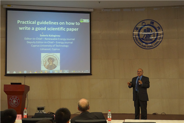 随后,Soteris kalogirou教授与同学们分享了自己的审稿经验,从科学期刊文章和报刊文章的区别切入,对撰写科学期刊文章的各部分的注意事项分别作了详细介绍。另外Soteris教授就撰写文章时的语法使用问题也作了详细的阐述,整个报告精彩纷呈,掌声不断。
