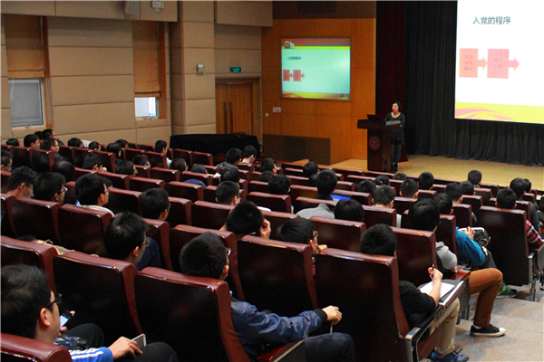 随后,于爱涛以一名想要在学院入党的普通同学为例,详细介绍了从递交入党申请书、团支部推优、确定为积极分子、参加党校培训、确定为发展对象、到最终支部接收其为预备党员,以及经过预备考察期成为中共正式党员过程中应该注意的问题。她强调,中国共产党是中华人民共和国的执政党,从递交入党申请书,立志成为一名中国共产党员开始,就要有吃苦耐劳和勇于奉献的精神。会后,入党积极分子就自身入党过程中可能遇到的问题提出了自己的疑问,于爱涛都详细作答,并给予积极鼓励。