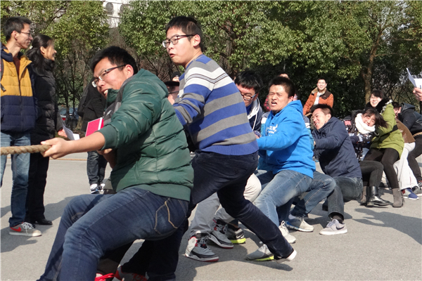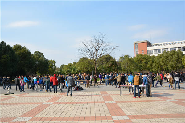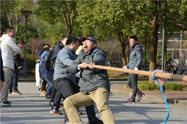 12点30分,伴随着裁判员嘹亮的哨音,激烈的比赛在广场上的三处场地同时开始。只见队员们紧握麻绳、双足蹬地、身体后倾、卯足全力,身边观赛的同学们则是喝彩不断、你来我往、加油助威。有的队伍实力雄厚、技高一筹,不出数秒就拿下赛局;有的队伍却是棋逢对手,势均力敌,半决赛时,F14级本科生队伍和F15级本科生队伍相遇,双方甚至展开了长达一分多钟的拉锯战。