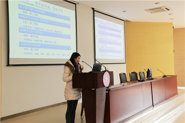 张杨详细说明了培养计划和专业分流问题,介绍自主转专业、院内分流、工科平台的分流政策和重修免修考试的具体安排,她希望同学们能主动关注学校和学院各项通知,充分学习理解各项政策,做好大学规划。
