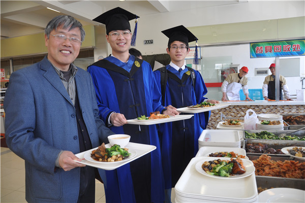 在餐厅里,毕业生们三五成群与自己的导师坐在一起,欢声笑语此起彼伏。他们有的披着庄严的学位服,刚和同学们拍完毕业照;有的则是刚才实验室出来,临走前还忙于与师弟师妹们交接工作。同学们表示平时和导师一起吃饭的机会也不多,学院以这种“文明、健康、节约”的方式迎接毕业既简朴又温馨,给毕业生与导师之间的情感交流创造了条件,使得师生留下深刻而难忘的回忆。