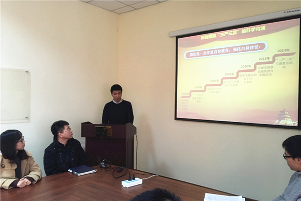 会上,洪辉首先结合研究生的实际生活阐述了“三严三实”的内涵和外延,以及怎样把“三严三实”的精神贯彻到日常的科研和生活中去。他指出,研究生从事科学研究时应当具备主动意识,多与导师讨论,而不是仅满足于完成导师布置的任务;在强调科研积极性的同时,同时需要注重自身品德的培养,严以修身,严以用权,严以律己,踏踏实实做事做人。随后三名刚刚获得国家奖学金的党员同学交分享了自己获得国奖的经验,以及就如何踏实科研谈了自己的看法。其中,陈梅姗同学认为端正科研和学习的态度是研究生立足的根本,陆超豪同学则就与导师同学们融洽的相处、如何规划自己的职业生涯分享了宝贵的经验,张同桐同学结合自己的实际情况,给大家讲述了时间分配的重要性。李魏老师细心聆听了大家的发言后,就如何确切落实“三严三实”提出了自己的看法。他讲到,“三严三实”对研究生来说,意味着要具备更严谨的科研态度和踏实的行事作风。