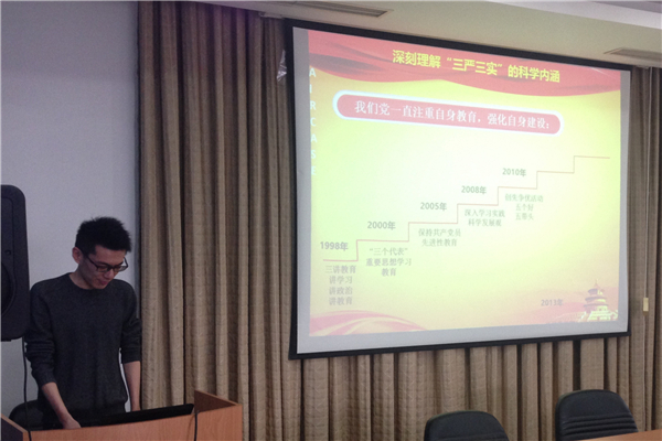 随后,党支部副书记丁杰带领与会党员同志认真解读并学习了“学在交大”暨“三严三实”的科学内涵。2014级学生代表、国家奖学金获得者袁宸同学向在场的2015级新生分享了自己的学习经验。他用自己的切身体验劝诫大家,研究生学习期间要树立明确的目标,珍惜时光。他认为,与本科阶段的学习不同,研究生应该用更广阔的视野看待书本上的知识,形成自己的思考。