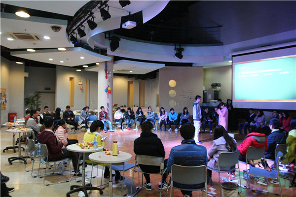 布置完成的博雅厅里茶点丰富、气氛融洽,大家来到博雅厅,联谊交流会正式开始,活动主要分为互记姓名、逢3握手、你答我猜、谁是鸡蛋等四部分。游戏中失败的同学会受到相应的惩罚,惩罚方法由大家各自设定,随机抽取,更添游戏的神秘与趣味。活动不久大家便侃侃而谈起来,惩罚中抑或一曲高歌,抑或一句对白,抑或一段舞蹈,抑或一个拥抱,都伴随掌声送来一片欢愉,女生的聪明开朗,男生们的踏实阳光,交织成联谊会最美的旋律。