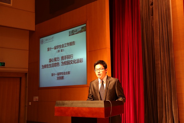 刘张鹏向大会作第十一届学生会工作报告,回顾过往一年工作,展望未来新篇。报告展现了一个“内建外推和谐”、“文体活动欣荣”、“学术活动高品位”、“院际国际交流协作积极”的学生会,期望新一届学生会承前启后,与时俱进,锐意革新,再创辉煌!