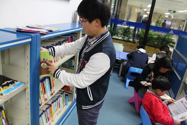 9点半,志愿者们准时到达上海图书馆。图书馆管理人员进行了工作内容介绍以及任务分配。志愿工作分为三项:杂志上架、图书上架和借阅引导。杂志上架和图书上架的工作需要先分书,根据索书号把书按区域划分开,然后再将书上架。借阅引导工作需要指导读者使用自助借还书机,协助他们完成借书和还书。志愿者们明确了各自任务后,有条不紊地开始了一天的工作。负责图书上架的志愿者不断地站起蹲下,将每一本杂志和图书小心整齐地放置到正确的地方;借阅引导的志愿者耐心细致地帮助每一位读者尤其是年级较大的读者使用自助借还书系统。工作内容虽然并不复杂,却需要志愿者们保持耐心、细心和热情来完成。一天下来,志愿者们的表现得到了工作人员和读者的一致好评。