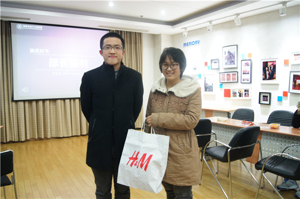 穿插在颁奖之间的是游戏与部长赠礼的环节。丰富而有趣的游戏调动了场内气氛,促进了部长和干事的沟通,也增强了各部门之间的友谊。此外,通过现场随机抽签,每位部长把他们精心准备的礼品赠送给团委的幸运儿,并借此机会表达了他们美好的祝愿。