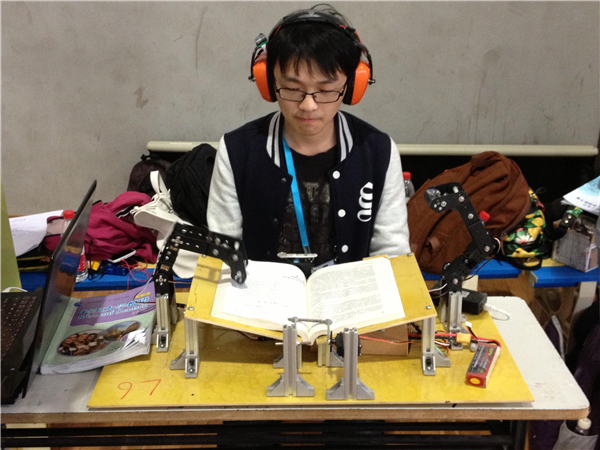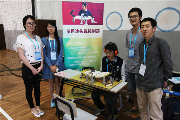 赵心蕊、叶欣、杨珂、王路瑶、伍维翰团队制作的“多用途头戴式控制器”获得了大赛一等奖。该装置结合控制器与头戴式耳机,编写独特的算法,设计控制电路;装置通过头部的摆动、无线操控多种设备的方式,能够实现不同的运动,具有普适性。在现场,团队向评委专家展示了装置通过头部的左右转动实现翻书机控制纸质书翻页的功能,博得好评。