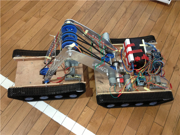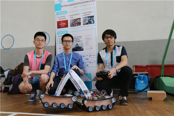 陈涛、刘弼邦、刘鹏、宋亮、吉喆团队制作的“基于履带结构的高适应性搬运机器人”获得了大赛二等奖。该搬运机器人采用了新型两段式履带机器人连接机构,移动速度快,适应能力强,能应对多种地形并高效搬运货物。