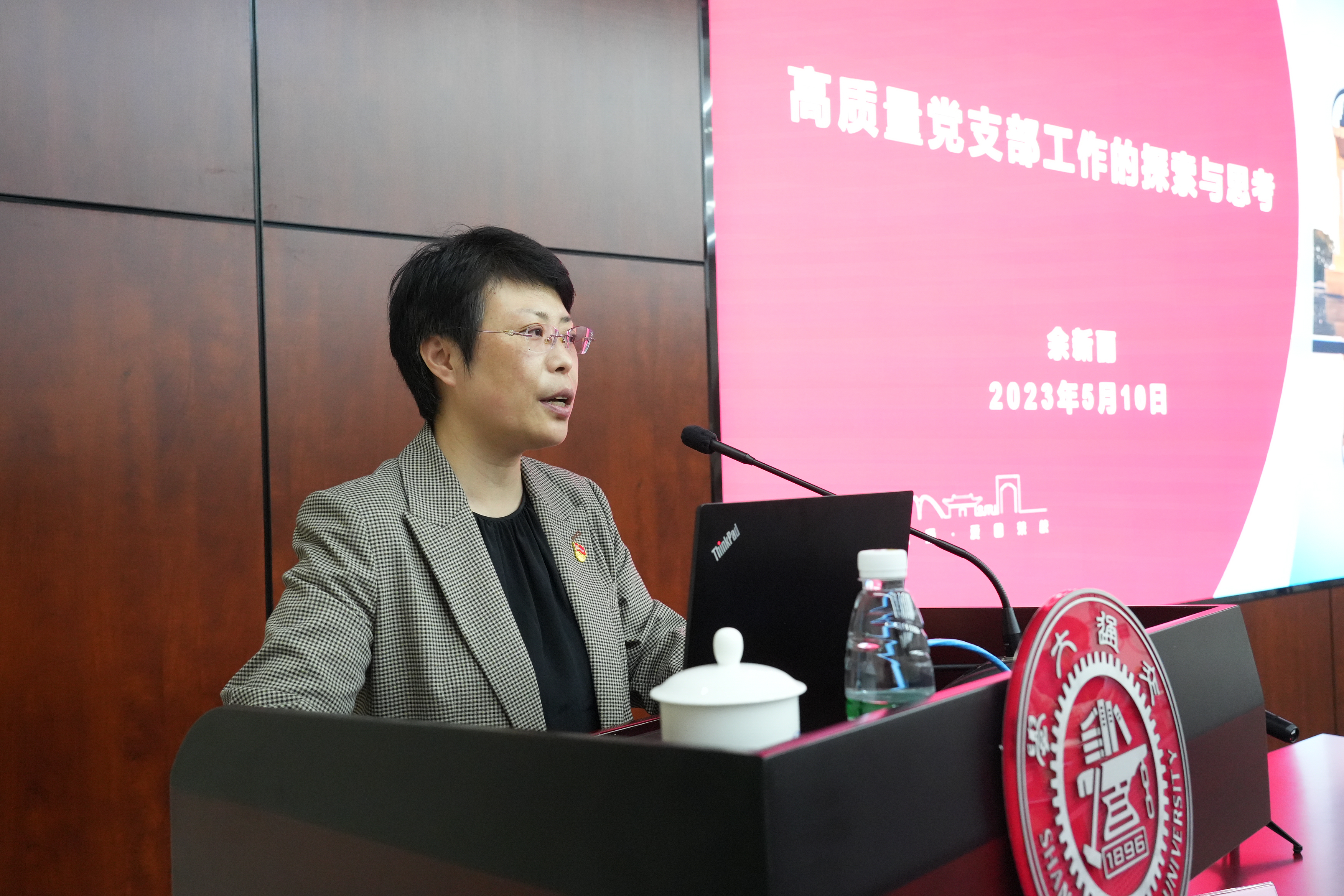 余新丽以“高质量党支部工作的探索与思考”为主题,围绕“基层党建工作的要求”“高质量支部工作要求”“基层党建工作的探索”“党支部建设指导建议”4个方面做专题讲座。她对党的二十大报告中关于“深入推进新时代党的建设新的伟大工程”的内容进行了系统解读,对照新时代高校党建“双创”工作重点任务指南、“双带头人”教师党支部书记工作室建设标准,阐释了高质量党支部建设的要求,强调了党支部的工作职责和功能定位,以及教师党支部的建设要求,提出了基层党建工作的重要抓手,为做好基层党务工作提供了新思路。她还介绍了学校新时代基层党建质量提升工程行动计划,对“党建+”建设工程进行了重点分析,从总体要求、支部设置、支委建设、发挥作用和组织领导等方面对支部建设提出了具体的指导建议,强调党支部要紧紧围绕人才培养、科学研究等工作,着力建设政治功能强、支部班子强、党员队伍强、作用发挥强的党支部。